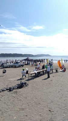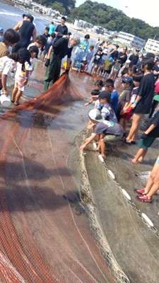 この地引網は鎌倉市の老人クラブの主催とのことですが、受付には市内の幼稚園の名前がたくさん貼ってあり、その保護者らしき方々とお子様たちがたくさん群がっていました!